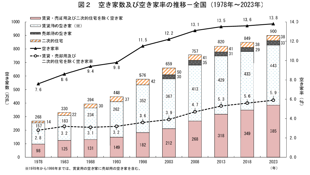 総務省が発表した令和5年住宅・土地統計調査、住宅数概数集計(速報集計)結果によると、空き家数は900万戸と過去最多、2018年からでも51万戸の増加、空き家率も13.8%と過去最高の数値となっています。