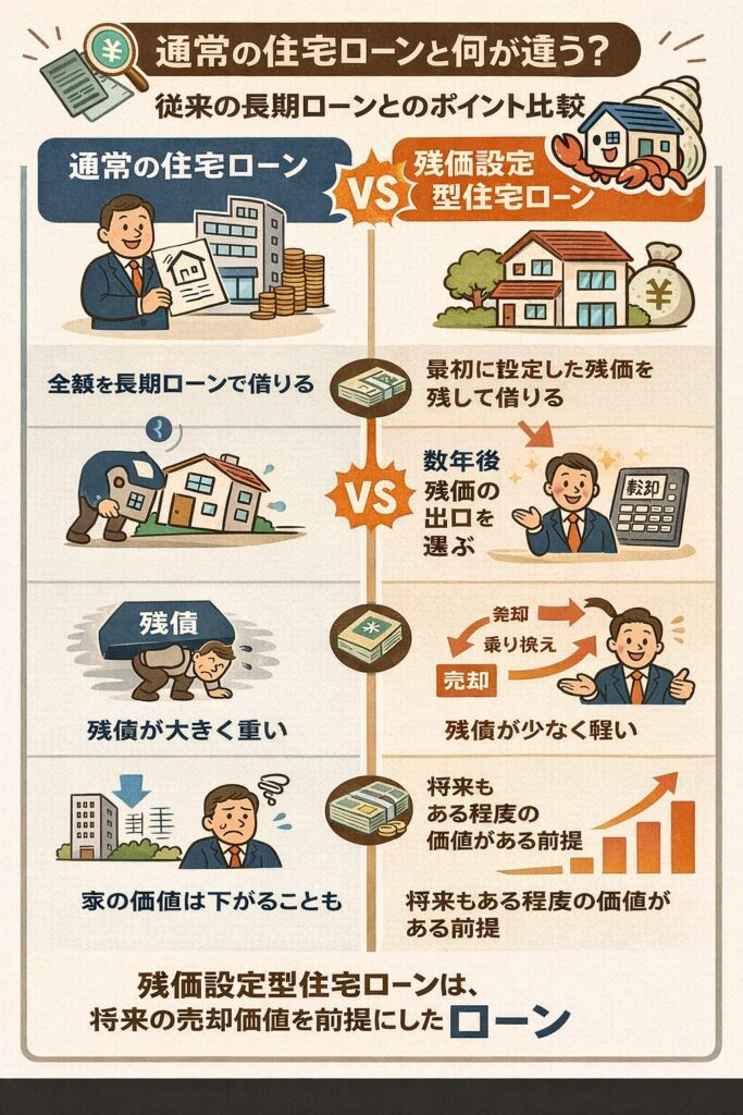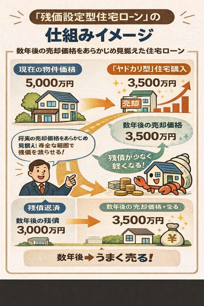 これは、自動車購入でおなじみの“残価設定”という仕組みを住宅ローンに応用したもので、将来の売却価値(残価)をあらかじめ設定し、その残価分を差し引いた額だけを返済していくという新しい住宅購入の選択肢です。