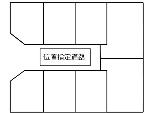 この場合なら位置指定道路の全体を1/8づつ共有しているケースが多いかも。古いタイプの分譲地では、分譲した不動産会社の所有になっているものもありますが、その場合水道、ガスなどの引き込みをやり直す場合、その不動産会社の承諾が必要になり、許諾料を請求されるケースもありますし、すでにその不動産会社が存在しない場合もありますので注意が必要です。