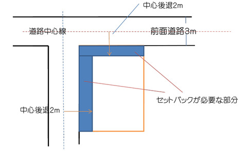 一方後退で、こちら側のみが1mセットバックしなければいけないこともありますし、角地の場合はもっとひどいセットバックのケースもあります。