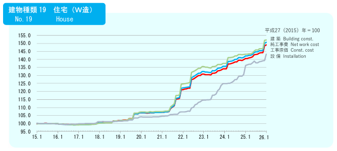 これは一般社団法人建設物価調査会が公表している建設物価建築費指数のグラフです。