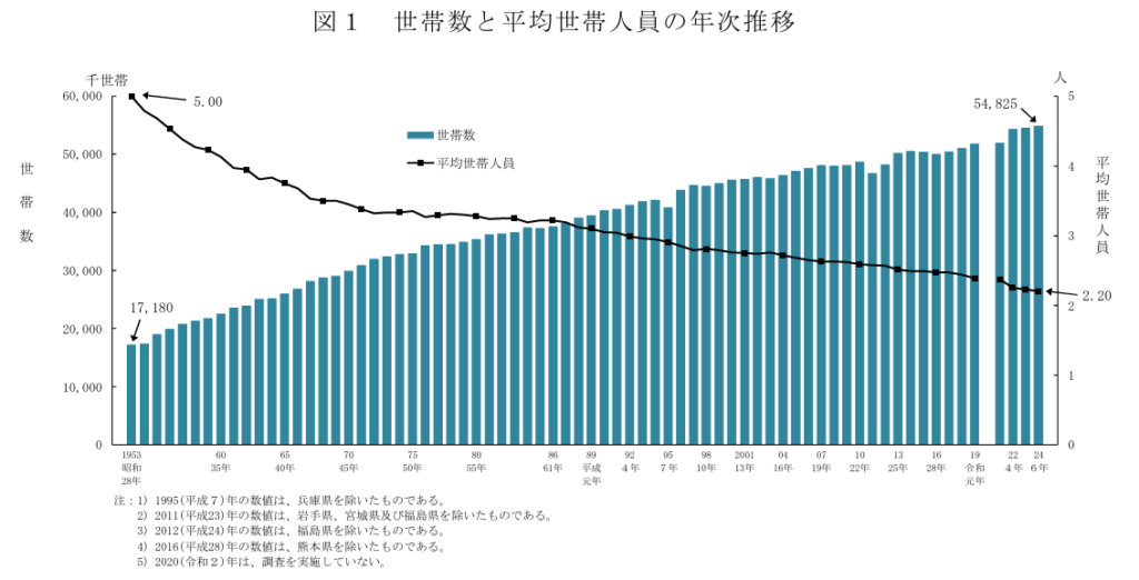 厚生労働省が発表している「世帯数と世帯人員の状況」のデータによると、人口は減ってるのに世帯数は増え、平均世帯人数も2.20人と大きく減少していることが伺えます。