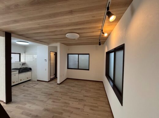清潔感あふれるモダンな内装: 木目調のフロアと黒のシーリングがおしゃれなリビング空間に再生済みです 。