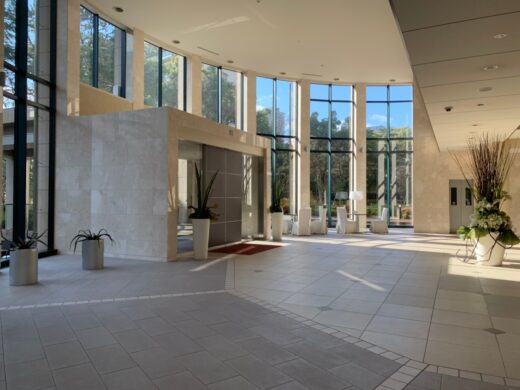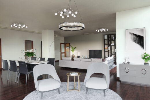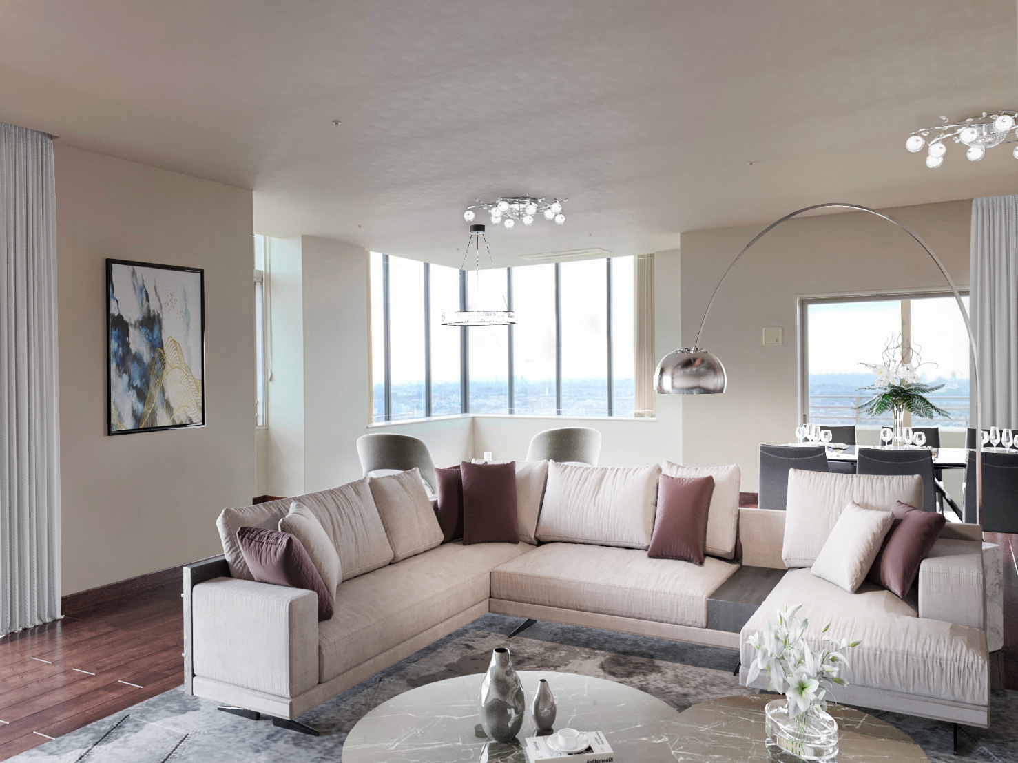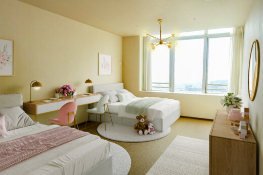リビングルームは54.6帖の広さがあるので、マッサージチェアやピアノを置いたり、ペットのゲージを置いたり、ベビーベッドを置いたりしてもゆとりのある広さです。