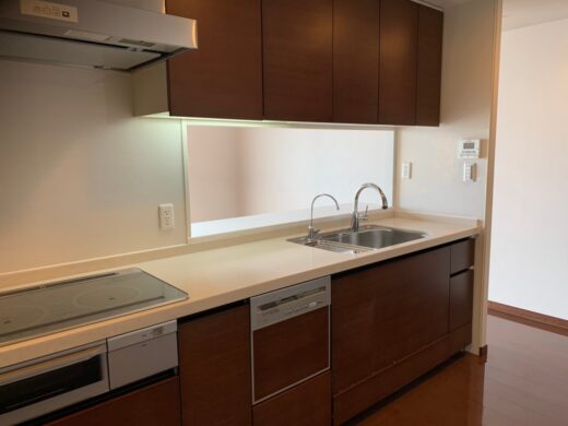 キッチンは、5.8帖のシステムキッチン。IHコンロは3つ口、食器洗い乾燥機、ディスポーザーがあるので毎日清潔に保てますね。